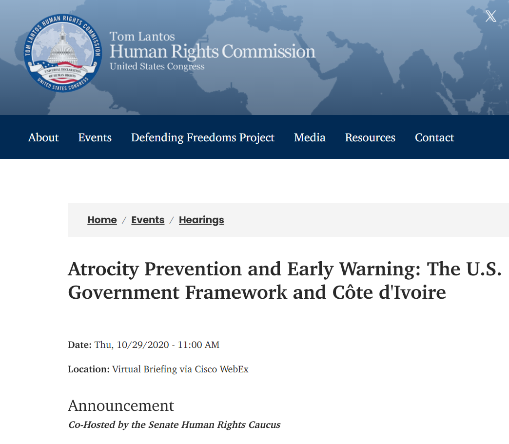 “Atrocity Prevention and Early Warning,” Tom Lantos Human Rights Commission briefing, U.S. Congress, October 29, 2020;